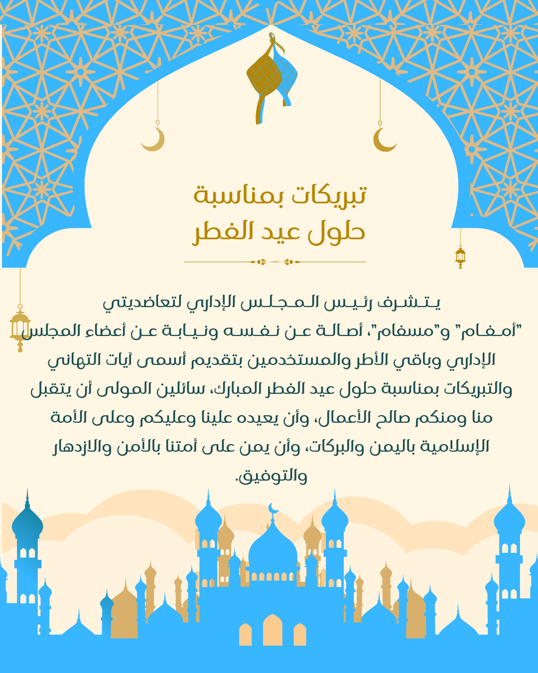 A l’occasion de la fin du mois sacré de Ramadan, le Président des mutuelles OMFAM & MUSFAAM vous souhaitons, à vous et à vos proches, un Aïd béni et joyeux ! Que cette occasion propice vous apporte d'abondantes bénédictions, du bonheur et de la prospérité."